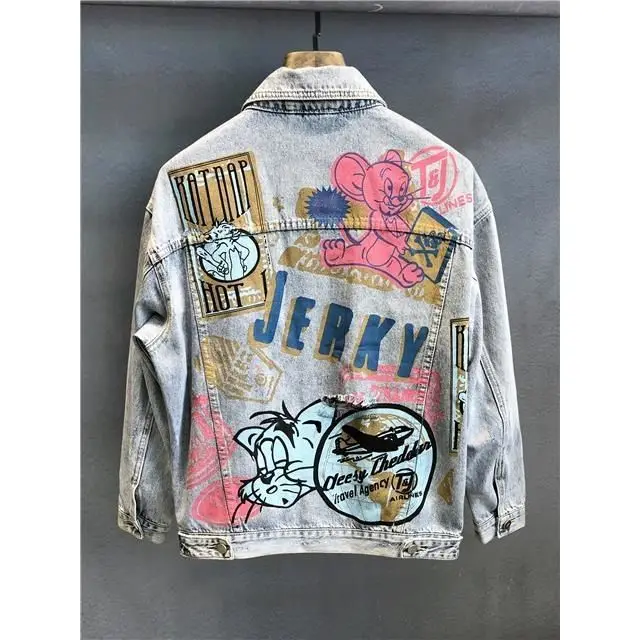 Fashion Cartoon Graphic Print Denim Jacket Men Streetwear Trend Hole Casual Loos
